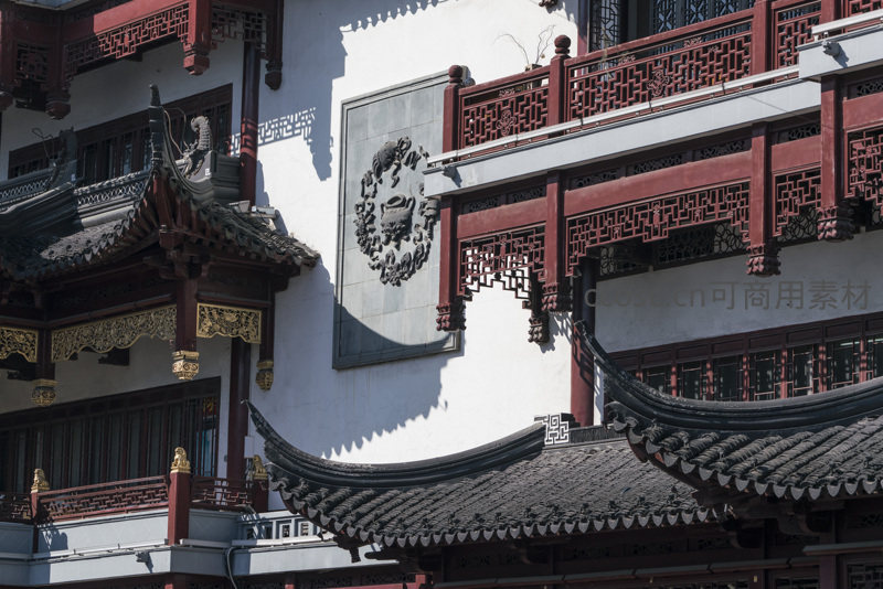 阳光洒在白墙与深色屋檐上,精美的木雕栏杆与浮雕壁画相映成趣,展现中国传统建筑的细腻工艺。