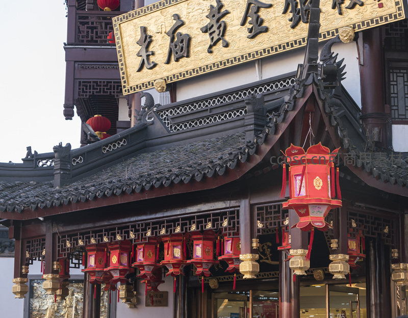 一家名为“老庙黄金”的传统店铺,金色大字牌匾高悬于古色古香的门楣之上,门前悬挂着一排排红色宫灯,营造出热闹而典雅的商业氛围。