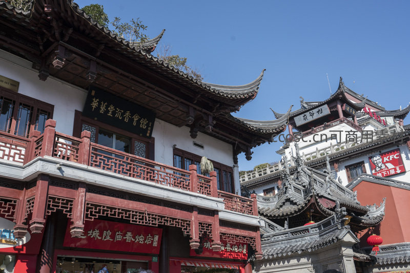 精美的传统木结构会馆建筑与现代餐饮品牌的醒目招牌同框出现,体现了上海城隍庙地区深厚的文化积淀与蓬勃的商业活力,传统与现代在此和谐共生。