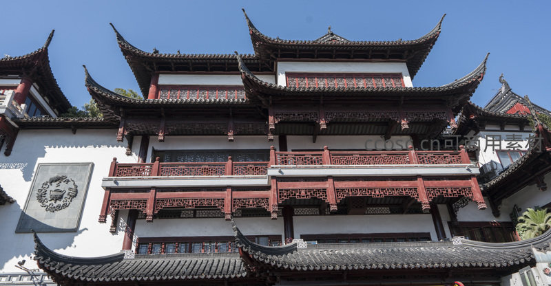 多层中式楼阁错落有致,白墙搭配深色瓦顶,配以朱红雕花栏杆,在晴空下尽显古典园林的层次感与庄重典雅的艺术风格。
