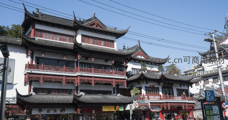 古色古香的商业街两旁是层层叠叠的传统楼阁,店铺招牌林立,行人穿梭其间,充满浓郁的生活气息和商业活力。