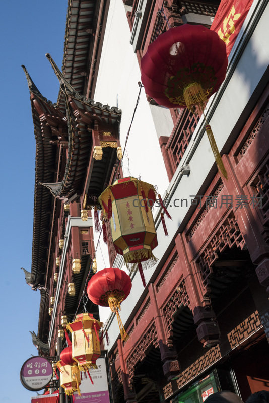 蓝天之下,古色古香的中式建筑群飞檐翘角,悬挂着喜庆的红色灯笼,展现出浓厚的传统文化氛围与节日气息。