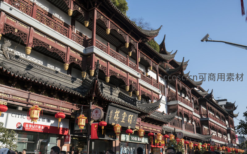 宏伟的古式商业楼宇沿街排开,精美的雕花窗棂和飞檐斗拱尽显匠心。街道上人头攒动,红灯笼高悬,营造出热闹非凡、充满文化底蕴的商业氛围。