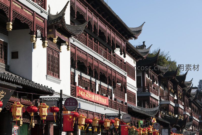 古韵街巷红灯笼高挂,飞檐翘角映蓝天