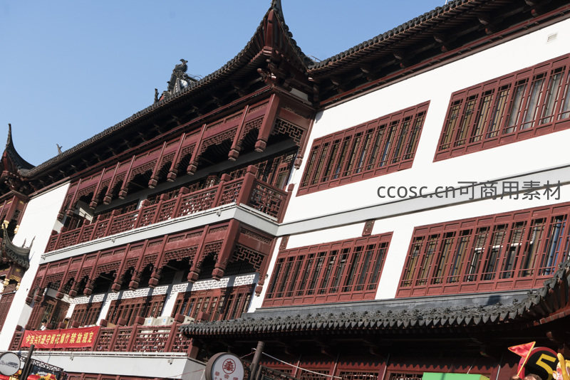 仰拍视角下,层层叠叠的中式楼阁在蓝天映衬下格外壮观,深褐色木质窗棂与精致雕花展现传统工艺之美,传递着深厚的历史文化底蕴。
