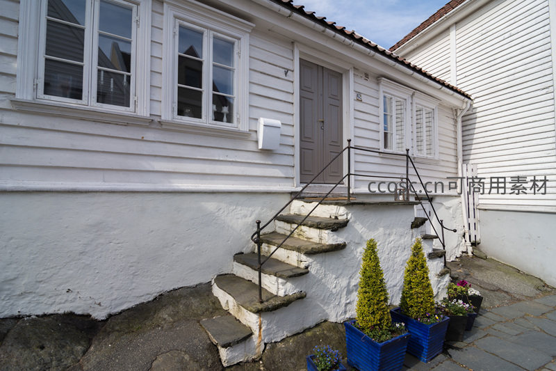 通往白色木屋的石阶古朴自然,两侧摆放着蓝色花盆中的修剪整齐的绿植,铁艺扶手增添安全与美感,营造出悠闲舒适的居住环境。
