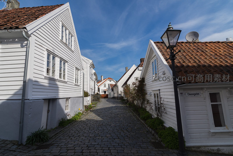 晴朗蓝天之下,一条铺满鹅卵石的小巷延伸至远方,两侧是典型的白色木屋配以红瓦屋顶,复古路灯静静伫立,整个画面充满宁静与历史感。