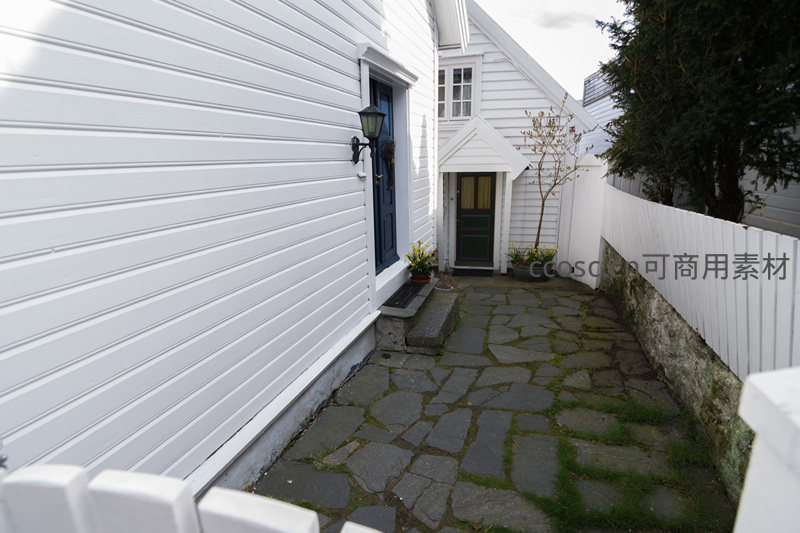 白色木屋外墙简洁优雅,旁边是一条由不规则石板铺成的小径,缝隙间生长着青翠绿草,搭配蓝色木门和小型盆栽,构成一幅宁静宜人的住宅庭院图景。