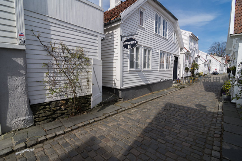 一条斜坡石径沿着白色木屋延伸,路边点缀着绿植和鲜花,街角的小店招牌在阳光下格外醒目,展现出北欧小镇生活的精致与惬意。