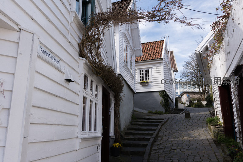 一条铺满鹅卵石的狭窄巷道,两侧是历史悠久的白色木质房屋,屋顶覆盖着红瓦,墙上爬满枯藤,尽显欧洲小镇的古朴与静谧。