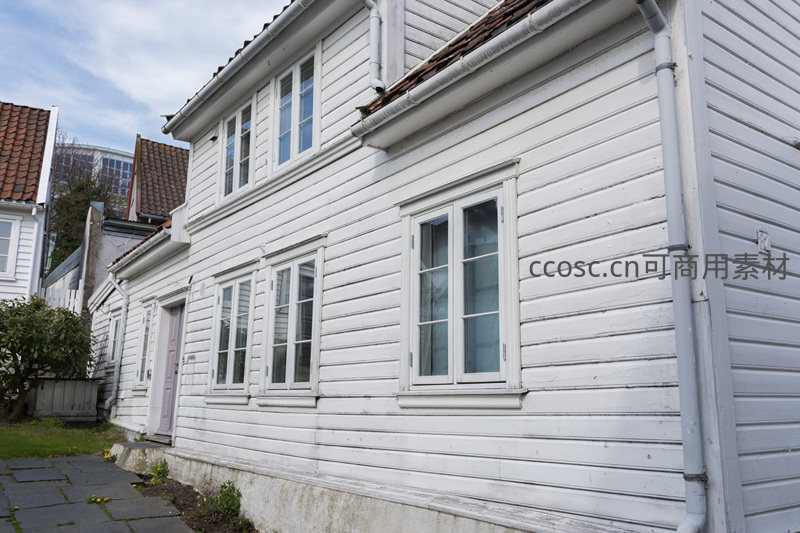 阳光下的白色木屋外墙与窗户