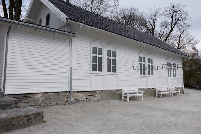 一栋长长的白色木屋侧身展示,墙下是斑驳的石基,前方空地上摆放着几排白色长椅,背景是高大的落叶树,整体画面简约而宁静。