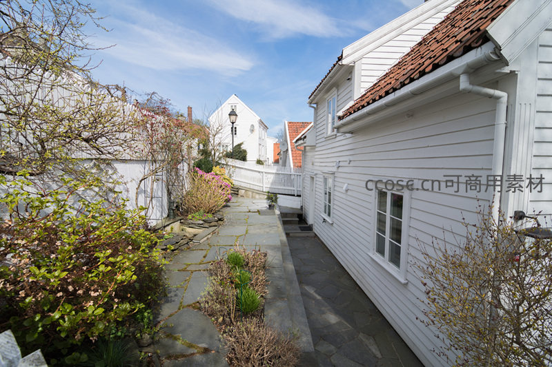 狭窄的石板小径两旁是白色木屋和盛开的灌木,蓝天白云下显得格外明亮,是体验慢生活与自然交融的理想之地。