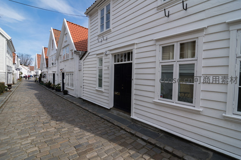 一条铺满鹅卵石的狭窄街道延伸向远方,两侧是整齐排列的白色木板房和红色屋顶,在蓝天白云下显得格外清新明亮。
