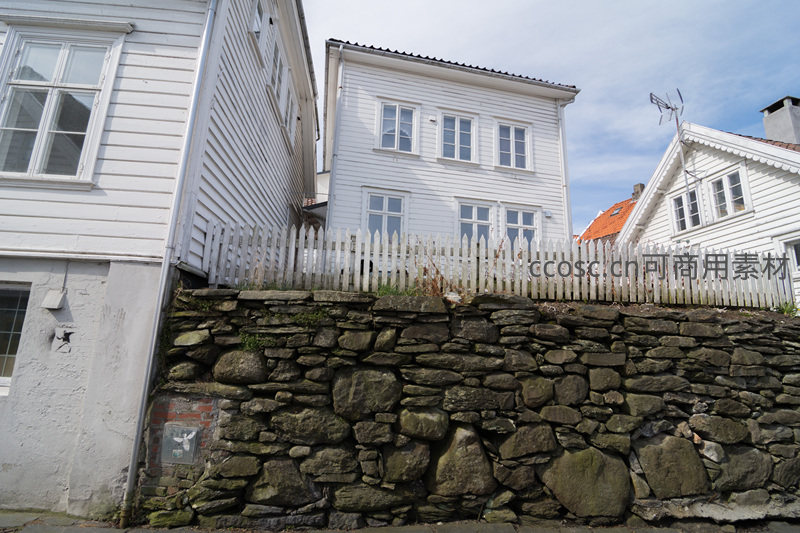 坚固的石墙与洁白的尖桩栅栏形成鲜明对比,衬托着背景中简洁优雅的白色木屋,展现了北欧地区独特的建筑美学与自然融合。