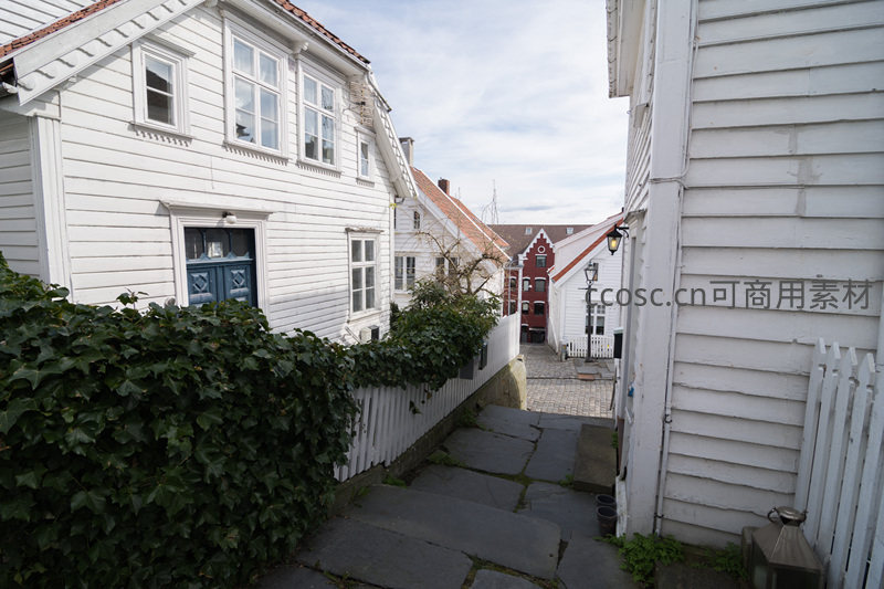 茂密的绿色藤蔓覆盖着白色围栏,引导视线穿过石阶小巷,远处隐约可见一栋红色建筑,构成一幅充满层次感和生活气息的画面。