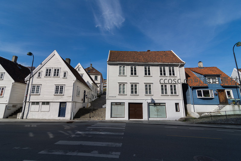 蔚蓝天空下,几栋具有典型北欧风格的白色和蓝色木屋沿街排列,红瓦屋顶与现代斑马线形成对比,展现了传统与现代交融的城市街景。