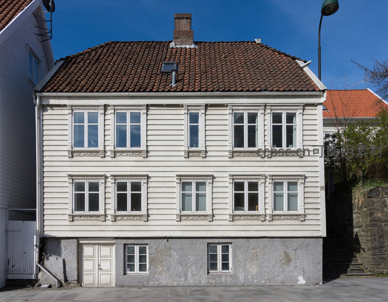 一栋三层高的白色木质外墙建筑,拥有整齐排列的多扇窗户和红色瓦片屋顶,底层为灰色石材基座,展现了北欧传统民居的结构与美学细节。
