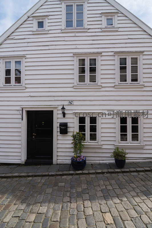 门牌号为47的白色木屋矗立在石板铺就的街道旁,黑色大门沉稳大气,两侧对称的窗户和门前的盆栽植物增添了生活情趣,展现了典型的北欧小镇街景风貌。