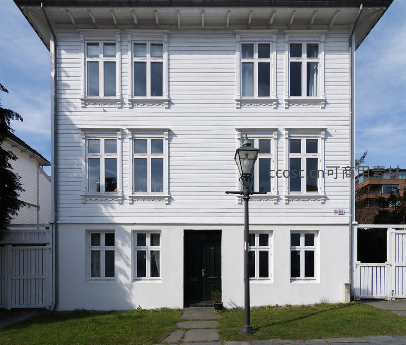 一栋三层白色木质结构房屋,搭配深绿色大门和古典路灯,窗台整齐,门前草坪青翠,阳光明媚,展现宁静的北欧小镇风情。