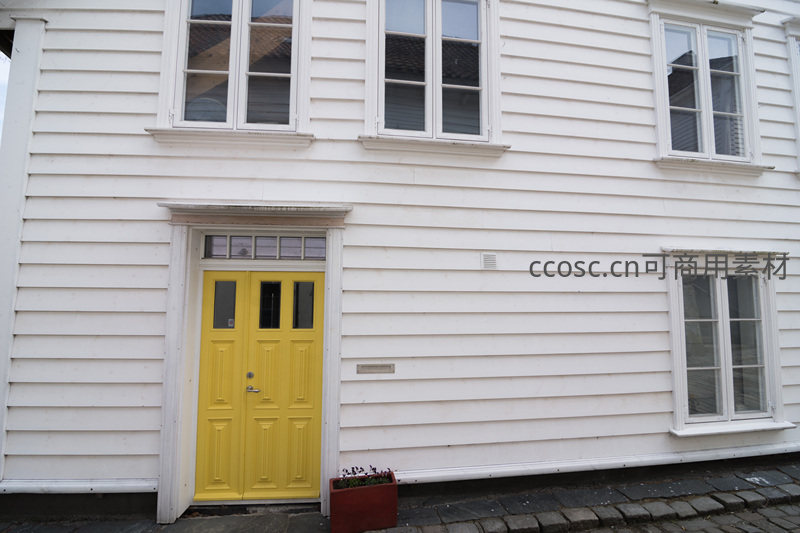 一栋纯白色的木质外墙房屋,搭配一扇明亮的黄色双开门,门前放置红色花盆,整体风格简洁明快,充满北欧小镇的宁静与温馨。