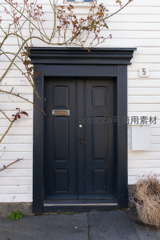 一扇厚重的黑色双开门,搭配同色系门框,门前有枯枝和干草盆栽,整体色调沉稳,透露出一丝静谧与岁月感。