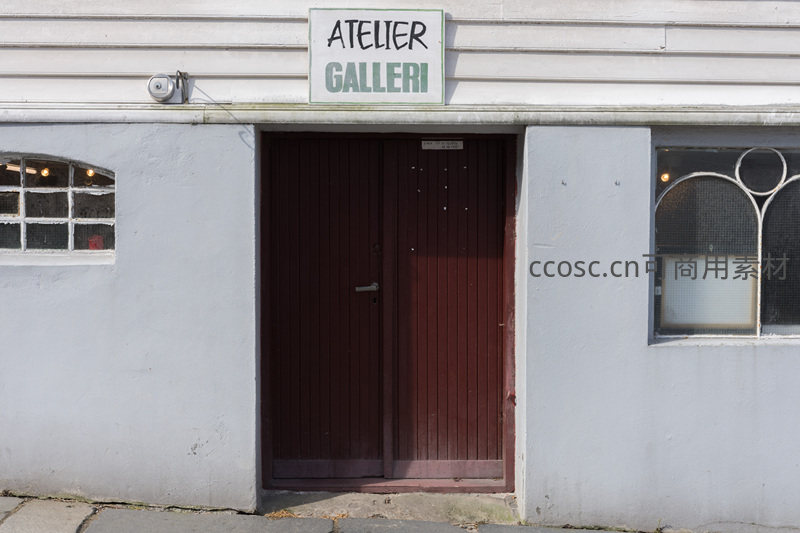 一座名为“ATELIER GALLERI”的工作室,其红棕色竖条纹木门与浅灰色墙面形成鲜明对比,上方悬挂着简洁的招牌,两侧拱形窗透出内部暖光,充满文艺气息。