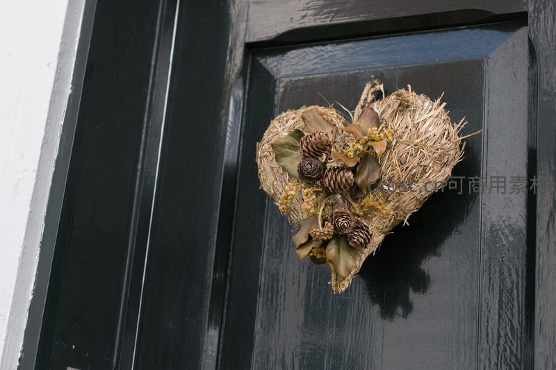 心形干草花环装饰在黑门上
