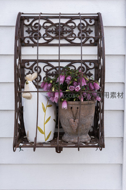 墙上悬挂着复古铁艺花架,内有盛开的紫铃花和带有植物图案的陶瓷花瓶,营造出温馨雅致的庭院氛围。