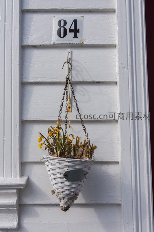 白色墙面上挂着编号“84”的门牌,下方是用铁链悬挂的白色藤编花篮,内有已枯萎的黄色水仙,记录季节更替的痕迹。