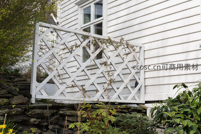 白色格栅围栏缠绕藤蔓,绿意盎然