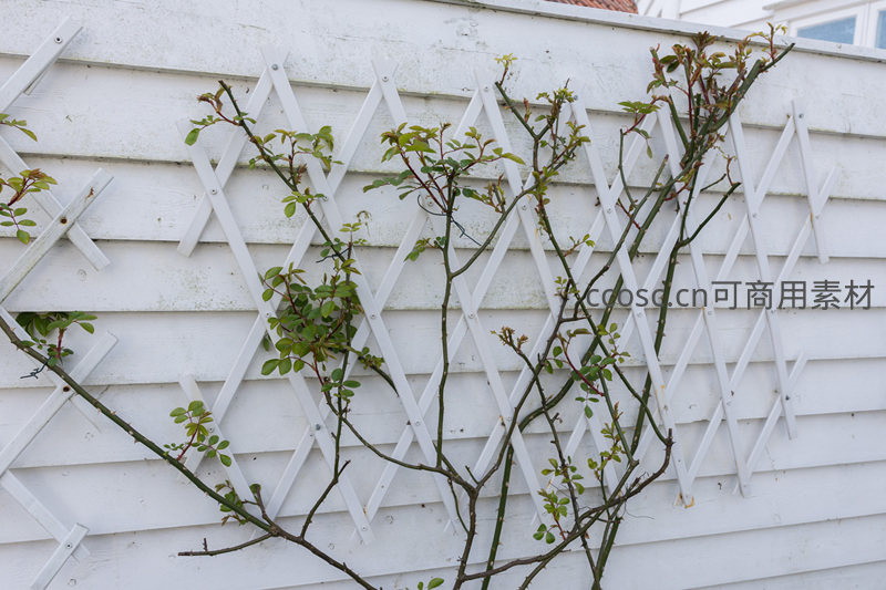 新生玫瑰枝条攀爬在白色伸缩格栅墙上