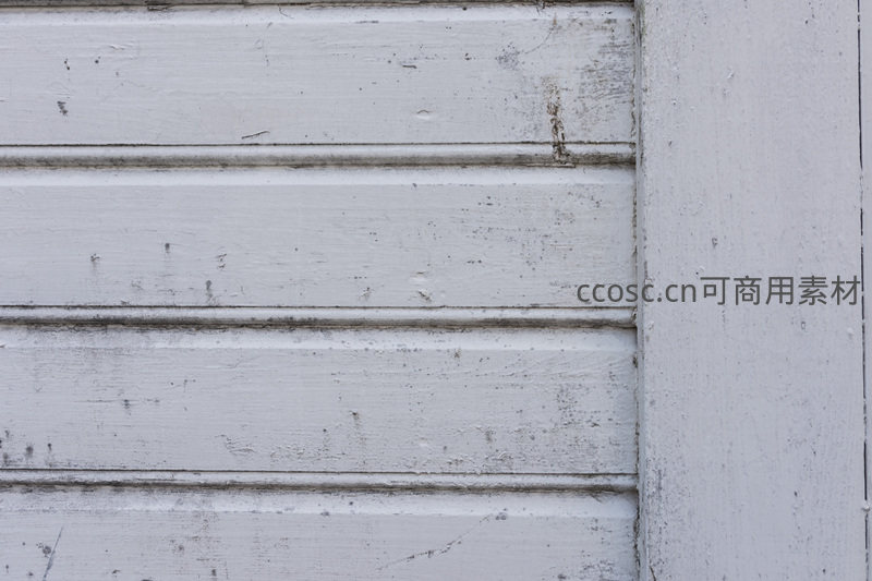 展示了白色木板墙在转角处的拼接工艺,清晰可见板材间的缝隙和边缘磨损,体现建筑的真实质感和年代感。
