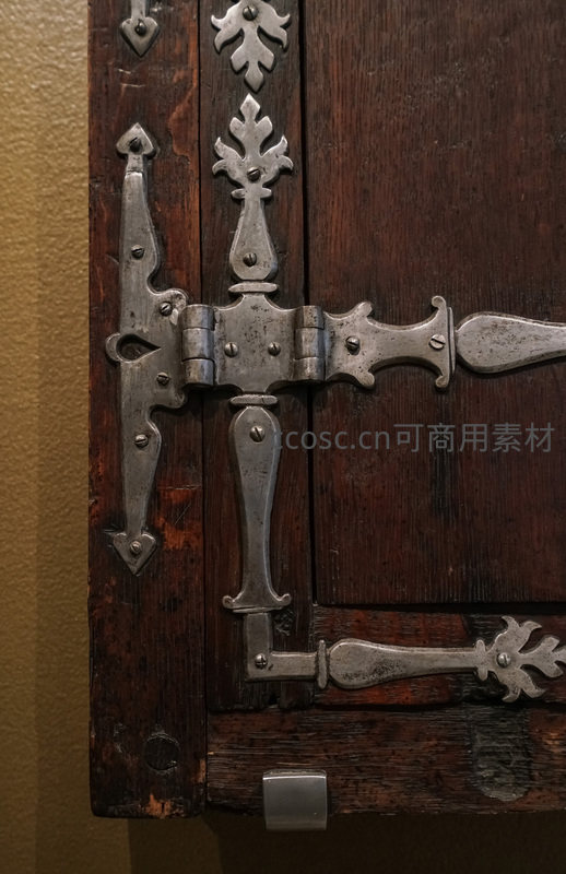 特写镜头捕捉到一扇厚重古旧木门上精美的雕花金属合页,其复杂的纹路和岁月痕迹彰显了传统手工艺的魅力。