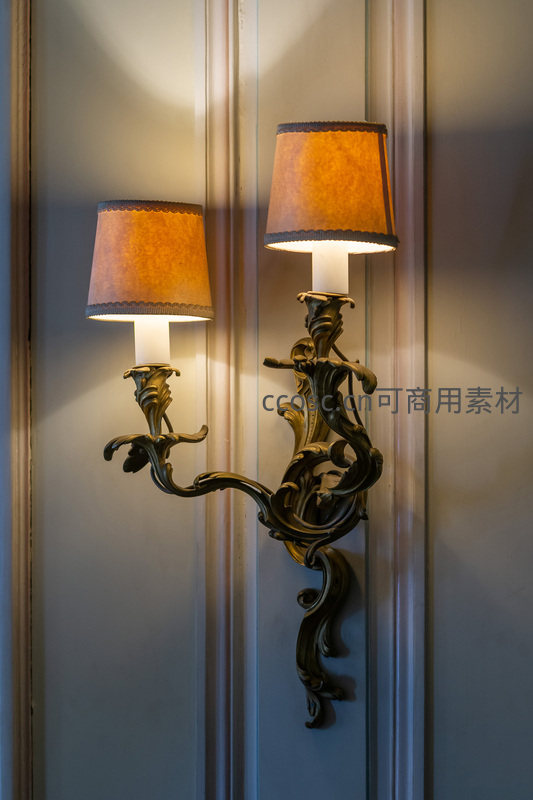 一对造型优美的复古壁灯安装在带有护墙板的墙壁上,黄铜色金属支架雕刻着繁复花纹,搭配暖黄色布艺灯罩,散发柔和光线,为空间增添古典韵味。