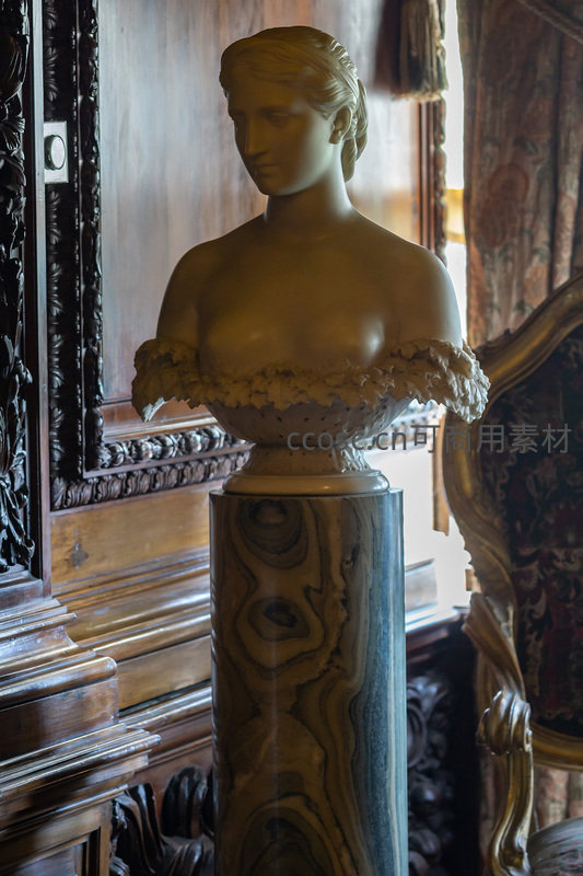 一尊古典风格的女性半身像雕塑,材质似为大理石或石膏,置于一个带有天然纹理的石柱之上。雕塑姿态端庄,背景是雕花木饰面,尽显艺术气息与历史感。