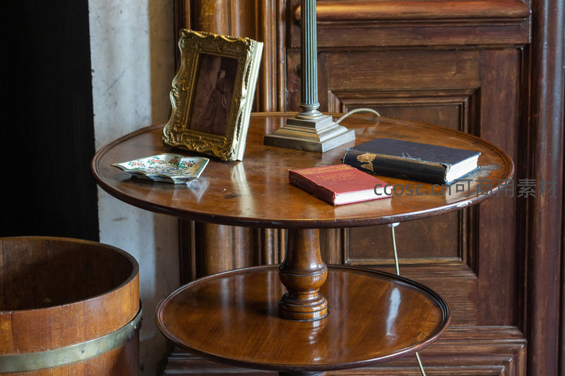 一张深色实木双层圆桌上摆放着几本旧书、一个镶金边的相框和一盏小台灯,旁边还有一个木桶。整个场景散发着浓厚的复古气息和宁静的阅读氛围。