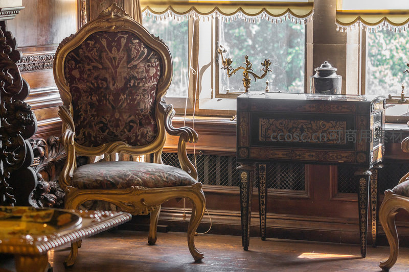阳光透过窗棂洒在雕工繁复的鎏金扶手椅与漆器边桌上,展现18世纪欧洲贵族宅邸的典雅与静谧。