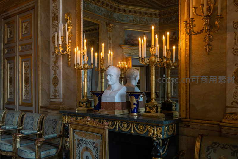金碧辉煌的宫殿内室,点燃的蜡烛在镜面中反射出温暖光芒,大理石半身像静立于雕花台座之上,四周环绕着繁复的金色壁饰与古典家具,尽显皇家气派与历史沉淀。