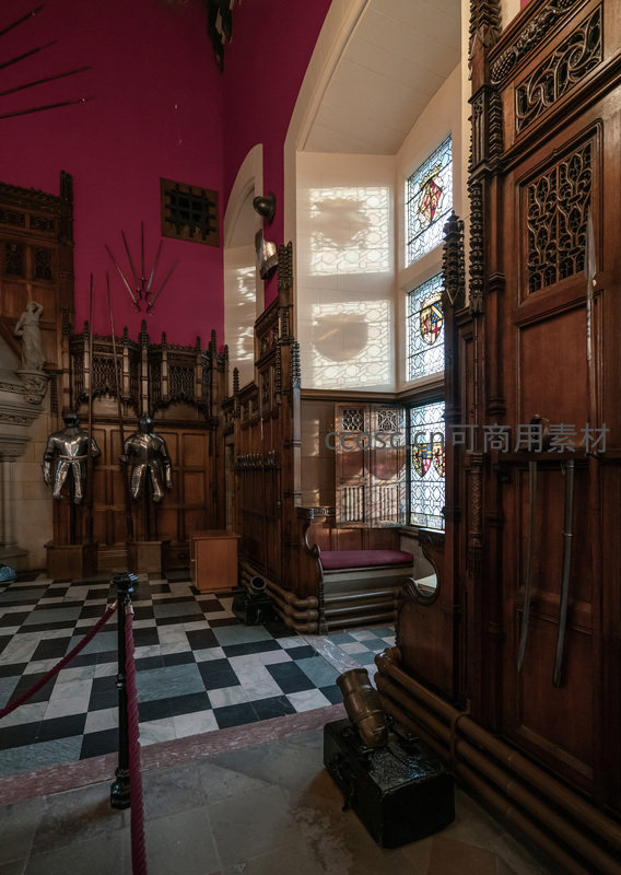 中世纪城堡大厅,盔甲陈列于彩窗与木雕之间