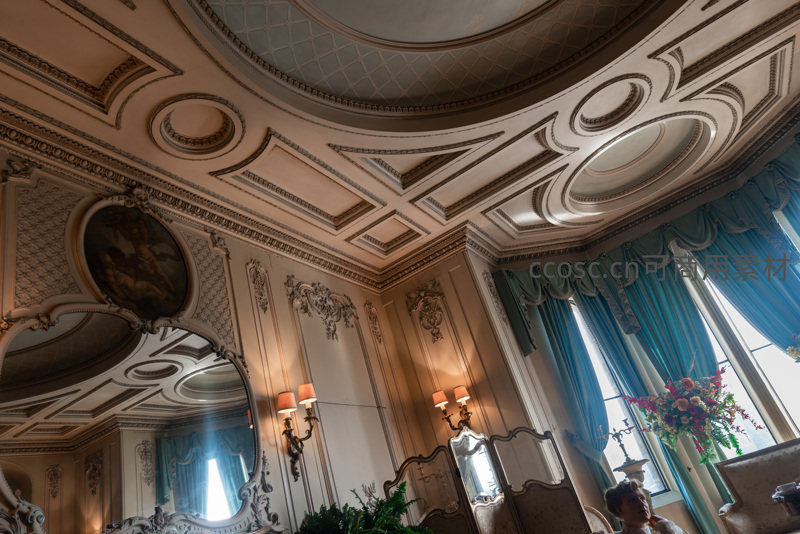 巴洛克天花板,浮雕壁画与蓝窗帘辉映