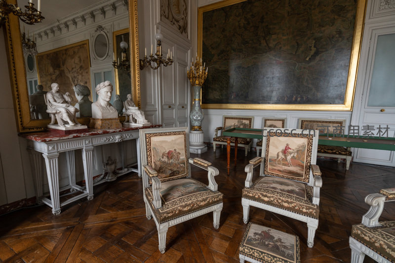白色大理石雕塑静立于案几之上,墙上的巨幅地图与镜面反射交相辉映,整个空间充满18世纪欧洲贵族的文化底蕴。