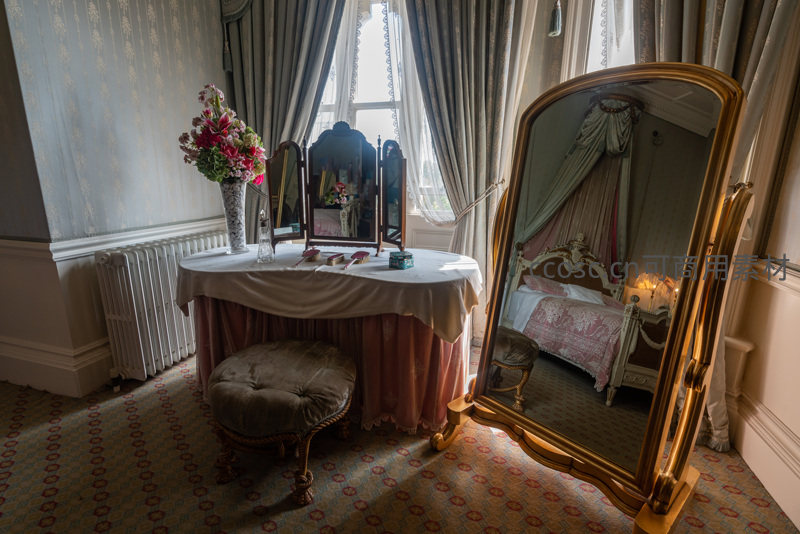 阳光透过窗帘洒在铺着白布的梳妆台上,鲜花与小镜摆设精致,大镜中映出粉红床幔的公主床,满是浪漫与温柔气息。