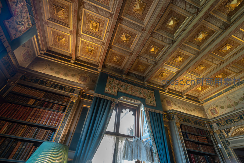 高耸的图书馆内,天花板镶嵌金箔方格图案,两侧书架满载典籍,蓝色窗帘轻垂,营造出静谧而庄严的知识殿堂氛围。