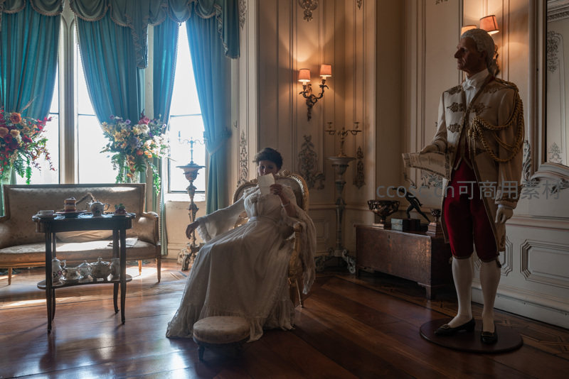 贵族沙龙场景,女士品茶,男士立像相伴
