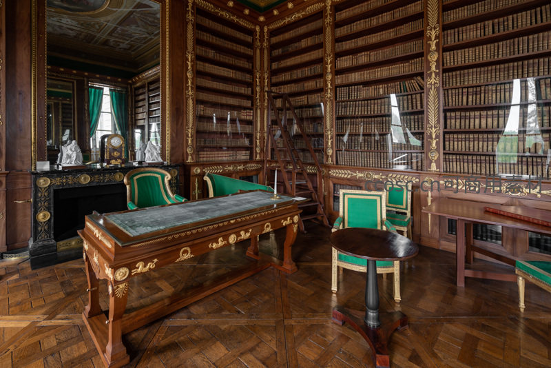 高耸的木质书架满载典籍,中央摆放精致书桌与绿色软椅,壁炉与镜面装饰映射出知识殿堂的庄重与宁静。