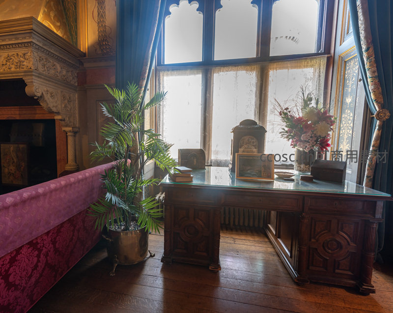 古典书桌旁绿植与阳光洒落窗台