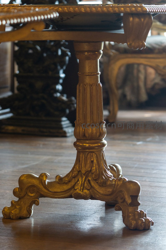 镜头聚焦于一张巴洛克风格桌子的镀金桌腿,其繁复卷曲的雕刻工艺展现极致奢华,是古典家具工艺美学的绝佳体现。