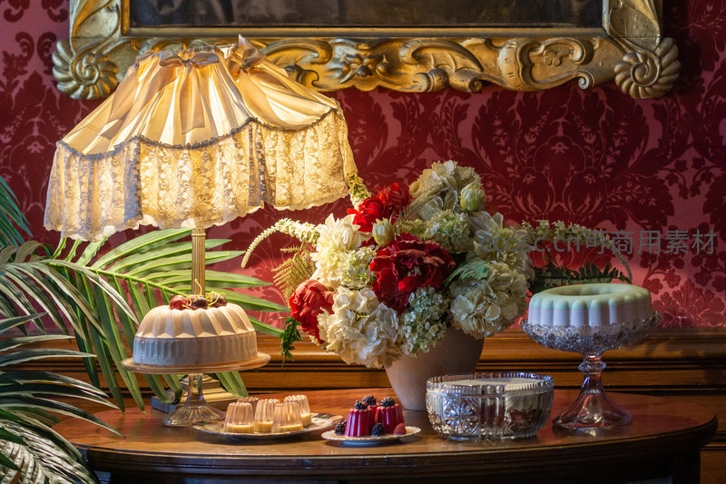 一张复古风格的木质餐桌,摆放着精致的蛋糕、果冻和鲜花,背景是红色花纹壁纸和华丽台灯,营造出温馨浪漫的下午茶或节日聚会场景。