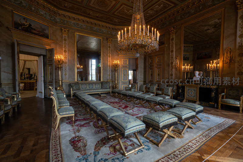 奢华宫殿大厅,水晶吊灯与宫廷座椅